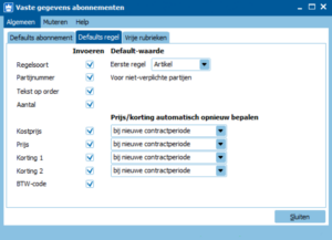 In het tweede tabblad ‘Defaults regel’ staat onderstaande scherm. Onder de kolom ‘Invoeren’ wordt aangevinkt of bij het aanmaken van een abonnement bij dit veld gegevens ingevoerd moeten worden of dat dit veld standaard wordt overgeslagen. Onder de kolom ‘Default-waarde’ wordt aangegeven welk type regel de eerste regel van een abonnement-order moet worden. Bij onderdeel ‘Prijs/korting automatisch opnieuw bepalen’ kan worden ingesteld hoe de prijzen en kortingen betaald moeten worden (niet/bij nieuwe contractperiode/bij elke factureerfrequentie)