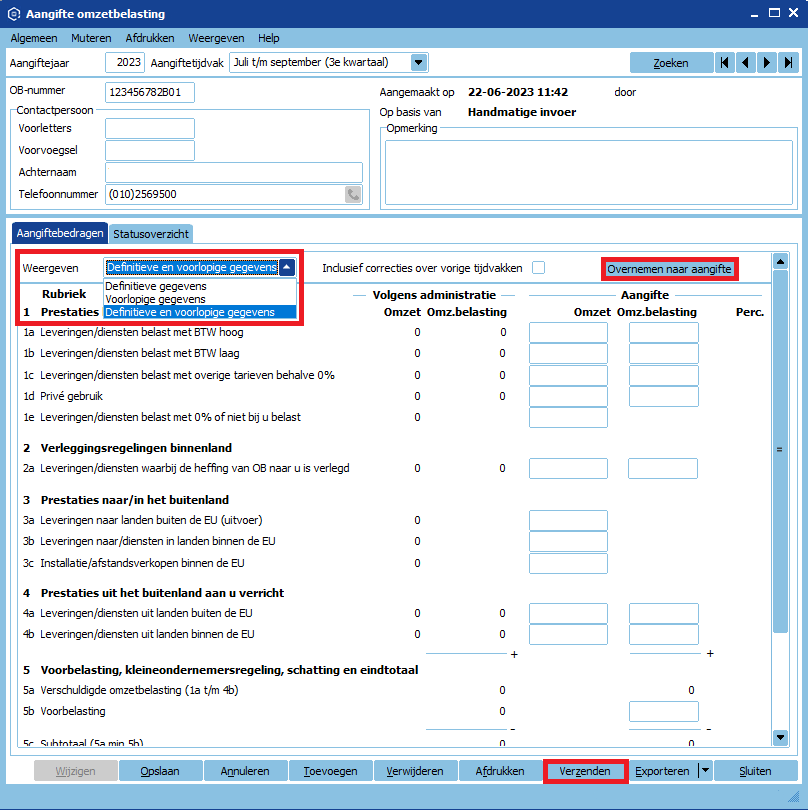 - Controleer voor de zekerheid of alle cijfers goed overgenomen zijn. Indien dit zo is, klik op Verzenden.
