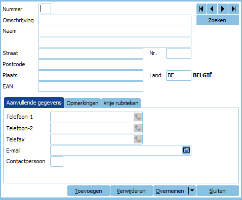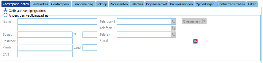 - Met de knop Overnemen is het mogelijk om het vestigingsadres of verzendadres automatisch over te nemen.