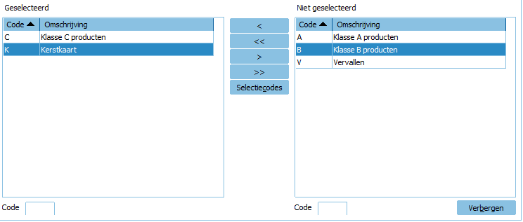 - Voor het Toevoegen, Wijzigen, Overnemen of Verwijderen van selectiecodes klik je op de knop Selectiecodes.