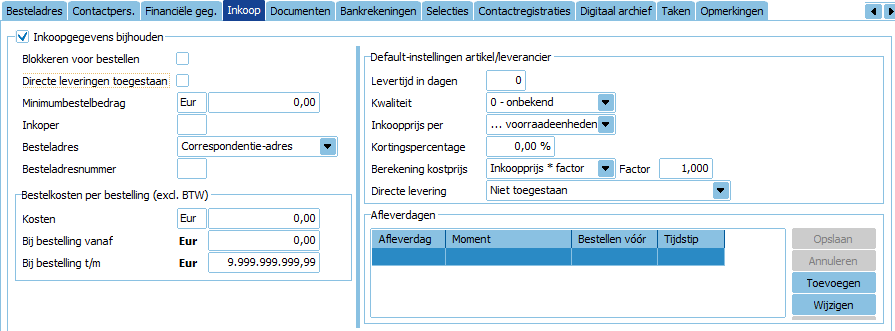 - Bij Afleverdagen leg je de informatie vast over de afleverdagen van deze leverancier.