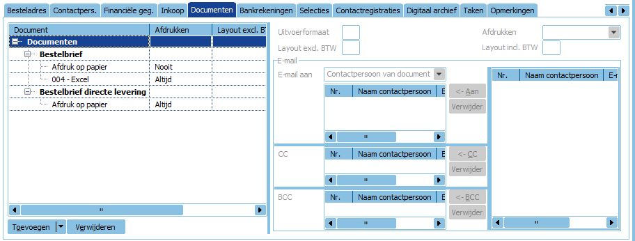 - Onder het tabblad Documenten kunnen specifieke lay-outs worden ingesteld die voor de crediteur van toepassing zijn. Zie documenten koppelen aan crediteuren.