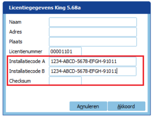 - De meeste licentiegegevens zijn al ingevuld bij een update. Dan hoeven alleen de velden ‘Installatiecode A’, ‘Installatiecode B’ en de ‘Checksum’ nog maar te worden ingevuld met de nieuwe waarden.
