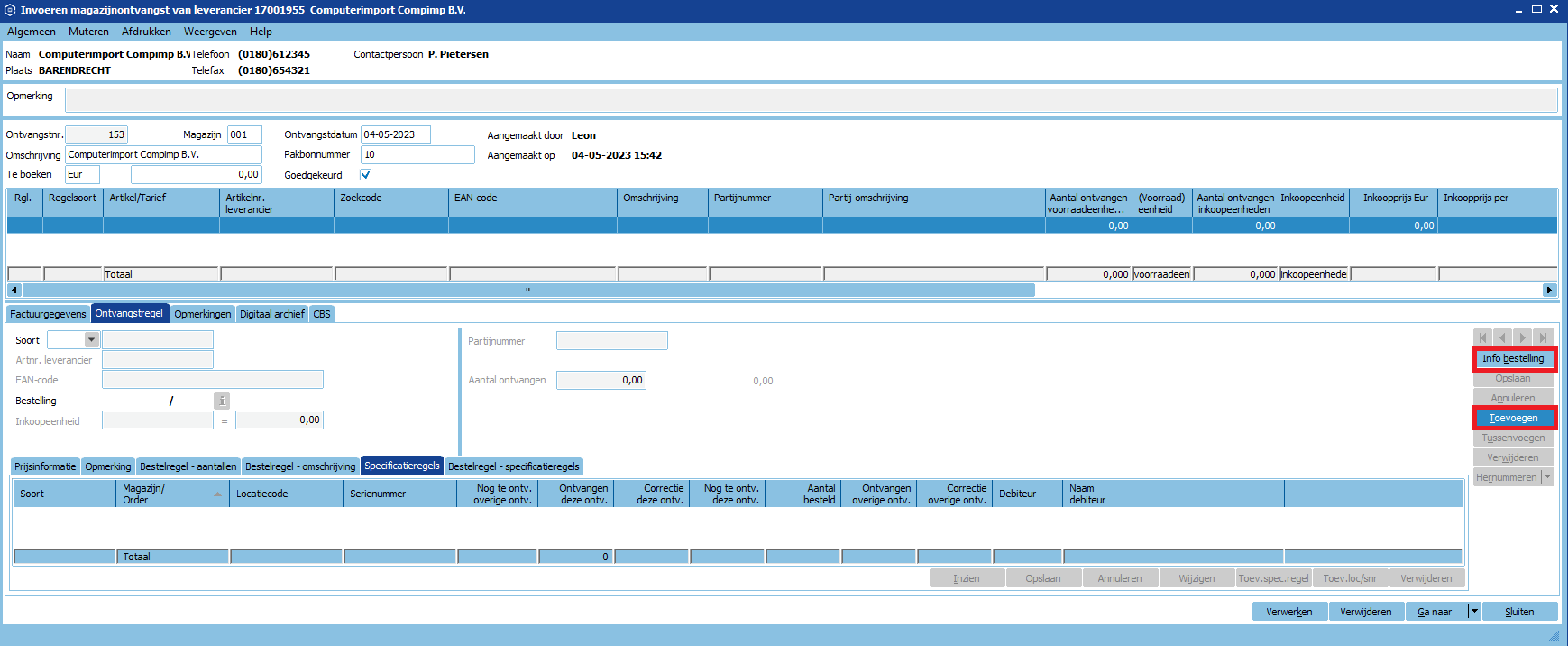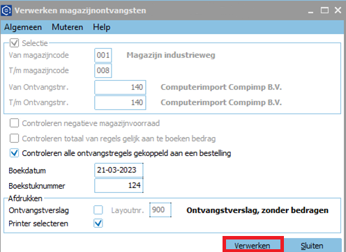 • Nu opent het scherm Verwerken magazijnontvangsten