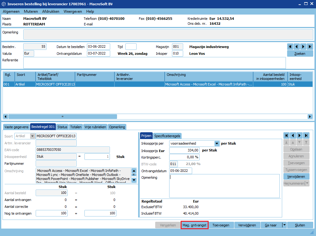 Ga naar hiervoor naar: Voorraad > Magazijnontvangsten > Invoeren magazijnontvangsten.