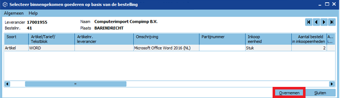 • Selecteer de bestelling waarvan de goederen zijn binnengekomen.