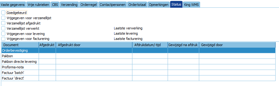De orders in KING kunnen verschillende statussen hebben. Daarmee wordt aangegeven waar de order in het proces zich bevindt. Dit is te zien onder tabblad Status.