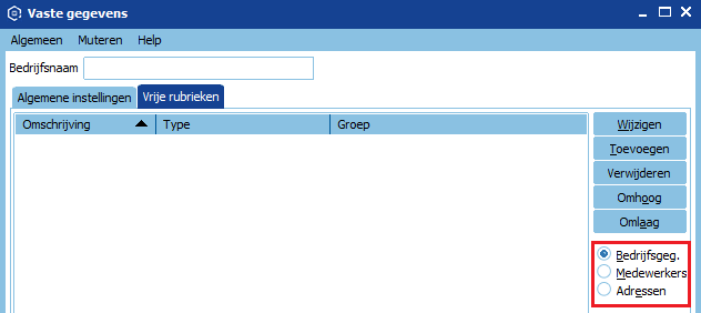 - De vrije rubrieken met betrekking tot de Medewerkers zijn te vinden onder Organisatie > Bedrijfsgegevens > Medewerkers. Selecteer een medewerker en klik op Wijzigen. Daar komen de Vrije rubrieken te staan.