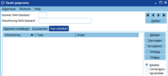 Stel je selecteert rechts in het scherm Relaties. In dit scherm worden dan alleen de vrije rubrieken van de relaties weergegeven en de knoppen rechts in dit scherm hebben dan ook alleen betrekking op de vrije rubrieken van de relaties.